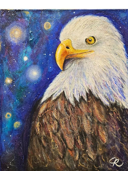 Die lebendigen Farben und dynamischen Pinselstriche verleihen dem Bild eine beeindruckende Präsenz und fangen die Stärke und Freiheit dieses Königs der Lüfte eindrucksvoll ein.