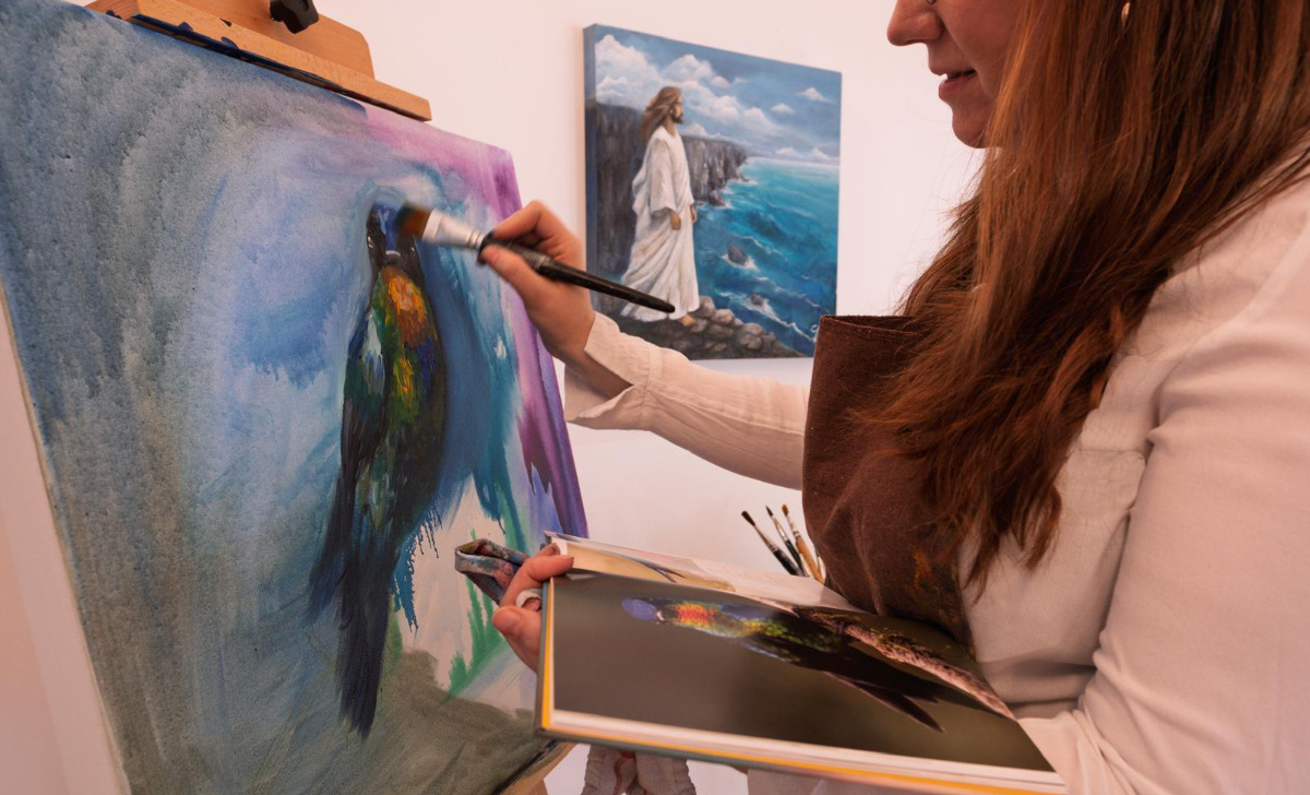 Ich schaffe Werke, in denen man tiefgründige Botschaften über Freiheit, menschliche Beziehungen und die Schönheit der Welt entdecken kann. Motive wie Federn, Vögel, Menschen und das Meer sind wiederkehrende Elemente in meiner Arbeit.